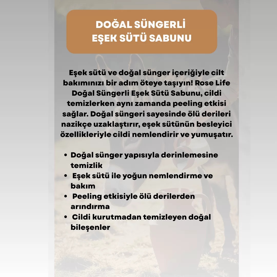 Eşek sütü ve doğal sünger içeriğiyle cilt bakımınızı bir adım öteye taşıyın! Rose Life Doğal Süngerli Eşek Sütü Sabunu, cildi temizlerken aynı zamanda peeling etkisi sağlar. Doğal süngeri sayesinde ölü derileri nazikçe uzaklaştırır, eşek sütünün besleyici özellikleriyle cildi nemlendirir ve yumuşatır. ✔ Doğal sünger yapısıyla derinlemesine temizlik